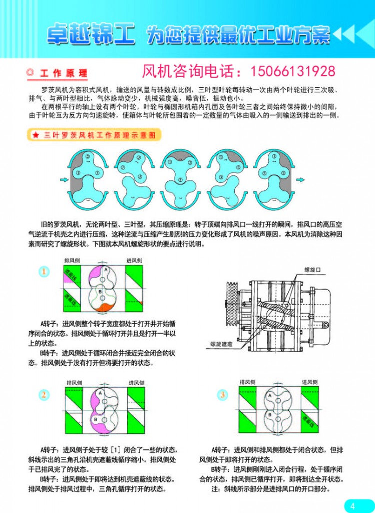 羅茨鼓風(fēng)機(jī)屬于容積式風(fēng)機(jī),輸送的風(fēng)量與轉(zhuǎn)數(shù)成比例, 三葉羅茨鼓風(fēng)機(jī)原理是:三葉型葉輪每轉(zhuǎn)動(dòng)一次由 2 個(gè)葉輪進(jìn)行 3 次吸、排氣,與二葉型相比,氣體脈動(dòng)變少,負(fù)荷變化小,機(jī)械強(qiáng)度高,噪聲低,振動(dòng)也小。在 2 根平相行的軸上設(shè)有 2 個(gè)三葉型葉輪,輪與橢圓形機(jī)箱內(nèi)孔面及各葉輪三者之間始終保持微小的間隙,由于葉輪互為反方向勻速旋轉(zhuǎn), 使箱體和葉輪所包圍著的一定量的氣體由吸入的一側(cè)輸送 到排出的一側(cè)。各支葉輪始終由同步齒輪保持正確的相位, 不會(huì)出現(xiàn)互相碰觸現(xiàn)象,因而可以高速化,不需要內(nèi)部潤(rùn)滑, 而且結(jié)構(gòu)簡(jiǎn)單,運(yùn)轉(zhuǎn)平穩(wěn),性能穩(wěn)定,適應(yīng)多種用途,已運(yùn)用于廣泛的領(lǐng)域。2什么是羅茨風(fēng)機(jī)