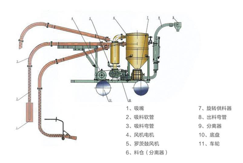 負(fù)壓系統(tǒng)適宜于從多喂料點(diǎn)輸送物料到一個(gè)卸料點(diǎn)。它的優(yōu)點(diǎn)是通過(guò)供料器的空氣泄漏和壓力降都很小,因而旋轉(zhuǎn)葉片供料器能得到令人滿意的使用效果。
